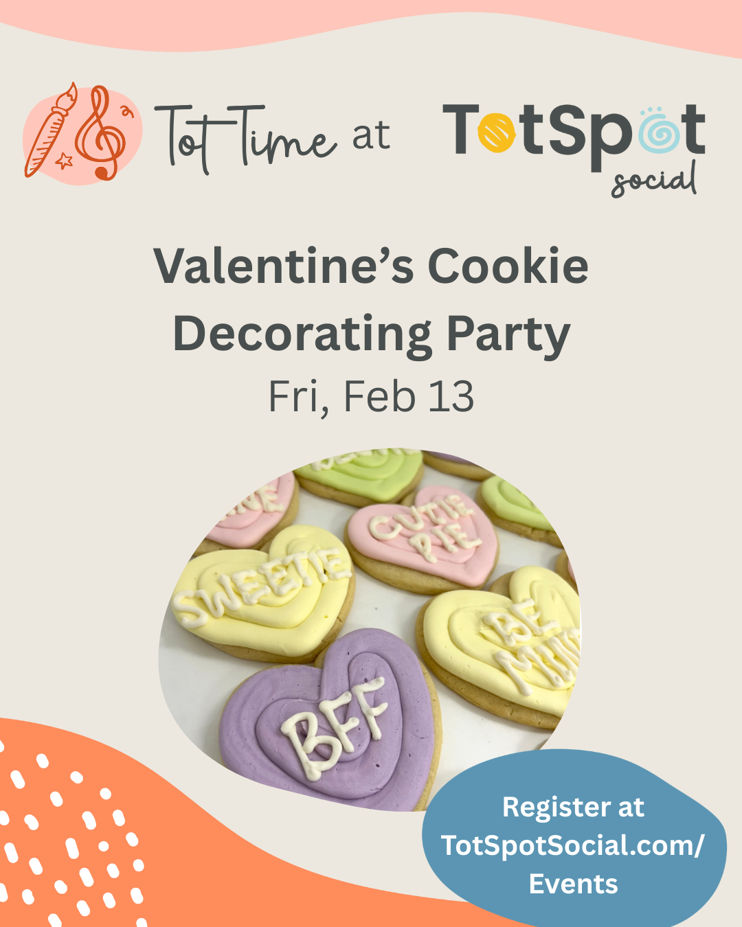 Celebrate Valentine’s week with a sweet treat and stress-free play! 💕 On February 13, your little ones will receive their own cookie decorating kit from beloved local bakery The Cup—complete with two cookies, icing, and sprinkles—then burn off energy during open playtime at TotSpot Social. It’s the perfect festive outing for kids 0–6!