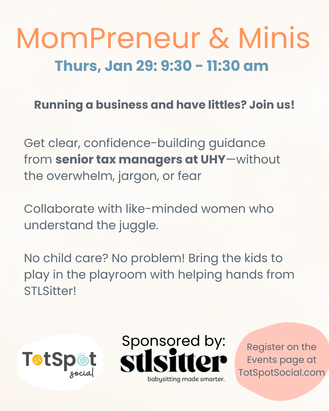 Join us for a special networking session designed just for entrepreneurial moms. Our guest speakers will be Esther Kamau and Ruma Saw, tax senior managers at UHY. Enjoy meaningful connections, organic conversation, and collaboration with like-minded women who understand the juggle. No child care? No problem! Bring the kids to play in the playroom with helping hands from STLSitter!